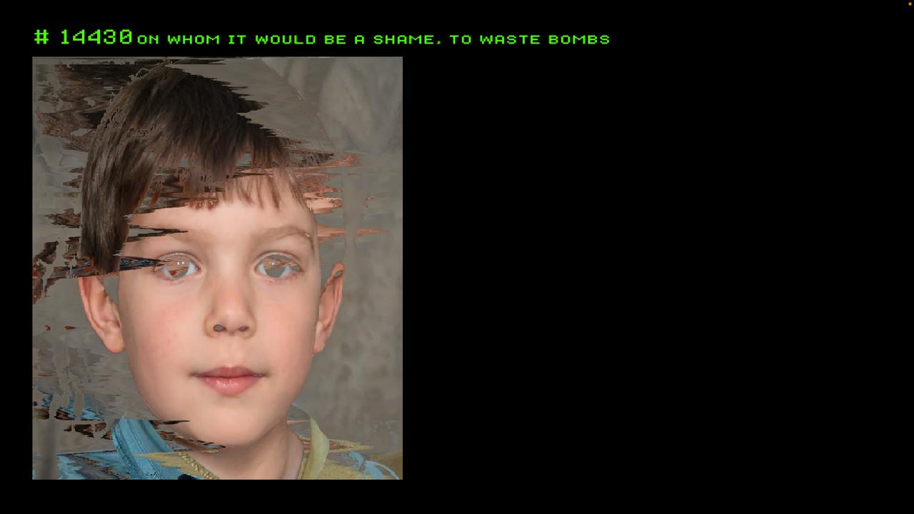The video system reflects the mechanical logic of the audio systems. For every cello note detected, a new AI-generated face appears. 19,750 faces appear over 28 minutes – approximately 11 faces per second. During PLL tracking phases, synthetic overlays appear on top of the AI faces14 ; during disruption phases, pixel sorting corrupts the image.
